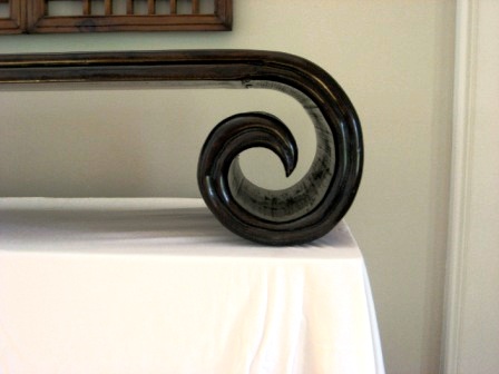 Low Scroll Table of Ju wood with beautifully rolled dovetailed supports. Originally used as a serving table while sitting on floor. C. mid-1800’s (Qing Dynasty).